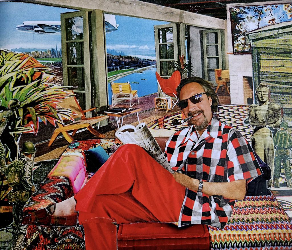 I assembled these pieces using a razor knife and glue. They are generally born from pieces of old catalogs, ads and magazines collected from yard sales and flea markets, along with photos, colored pens, postage stamps, junk mail and whatever else looks good.